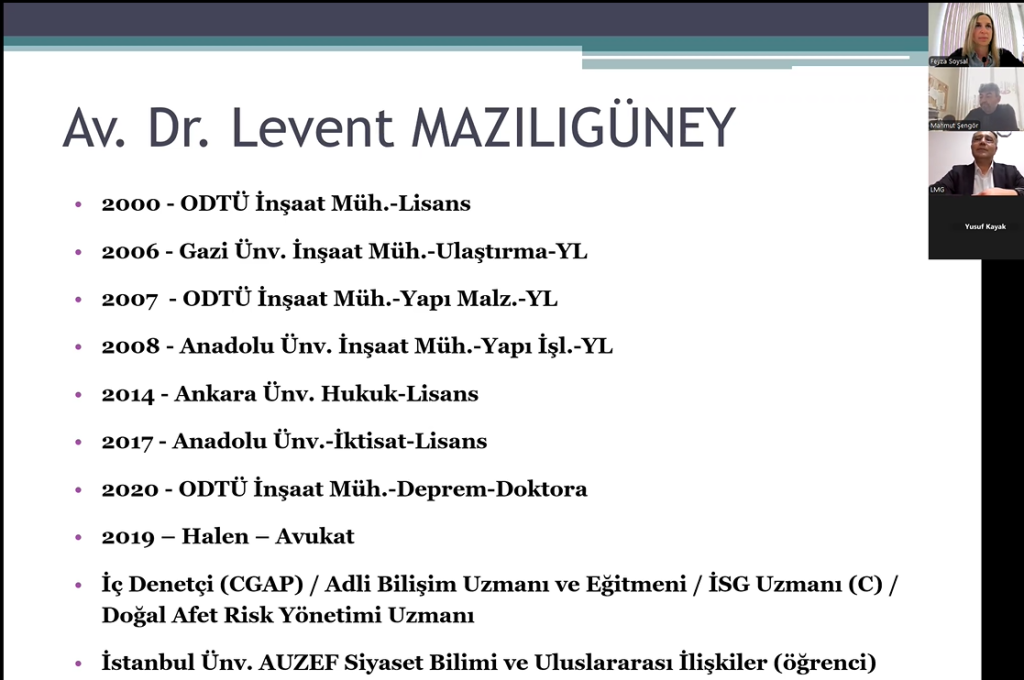 CE 337-İnşaat Mühendisliğinde Proje Yönetimi ve CE 415-İnşaat Mühendisliği Tasarımı I dersleri kapsamında 06.11.2025 tarihinde saat 13:30’da Zoom üzerinden Dr. İnş. Müh. ve Av. Levent MAZILIGÜNEY tarafından “İnşaat Mühendislerinin Hukuki Sorumlulukları” başlıklı bir seminer verilmiştir.
